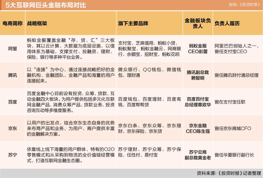 “五虎将”逐鹿中原,但因各自特点不同,战略战术终究有别。《投资时报》通过采访和梳理,抽丝破茧,探寻其各自的发展思路及定位。总体而言,阿里巴巴多维布局建设以数据和信用为核心的金融平台;腾讯拒绝“大而全”,定位于互联网与金融的“连接器”;百度发挥入口优势与金融机构铺开合作;京东要打造为用户、商户提供金融解决方案的“金融科技公司”;苏宁则主打消费金融,构建互联网金融生态圈。