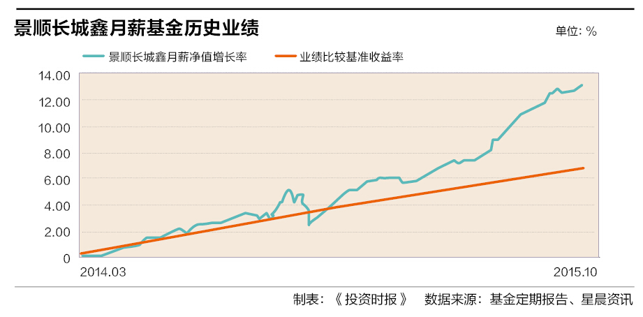 据晨星资讯数据显示,截至2015年10月30日,该基金过去三个月收益率为3.46%,在同类119只基金中排名第8位,强势进入领军者阵营。在半年期收益率排名中,景顺长城鑫月薪以6.96%的收益率在112只纯债基金中排名第14位,同样成绩斐然。