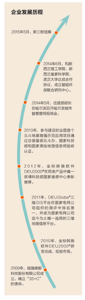 从最初的单一产品,珞珈德毅目前已发展成为以二三维一体化地理信息平台、高性能空间数据坐标转换、北斗高精度导航定位技术为核心的产品集群,在智慧管网、智能电网、北斗高精度位置服务等市场占据了优势地位。同时,该公司也涉足北斗高精度位置服务在保险行业的综合应用,及通讯运营商企业级资管系统等领域。