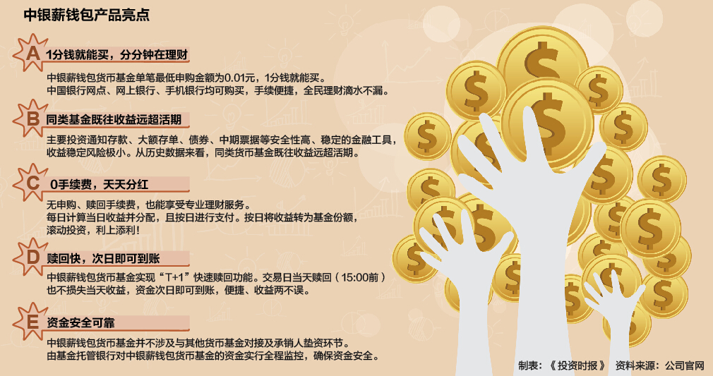 资料显示,中银薪钱包主要投资于通知存款、大额存单、债券、中期票据等安全性高、稳定的金融工具,收益十分稳定且远超活期。作为一款货币基金,中银薪钱包不仅投入门槛低,也拥有极佳的流动性,目前该基金的单笔最低申购金额仅为0.01元,1分钱就能买入,由于拥有“T+1”赎回功能,资金次日即可到账,真正做到便捷、收益两不误。此外,中银薪钱包并无申购、赎回手续费用,不仅每日计算当天收益并分配,做到天天分红,还按日将收益转换为基金份额,通过滚动投资,实现利上添利。