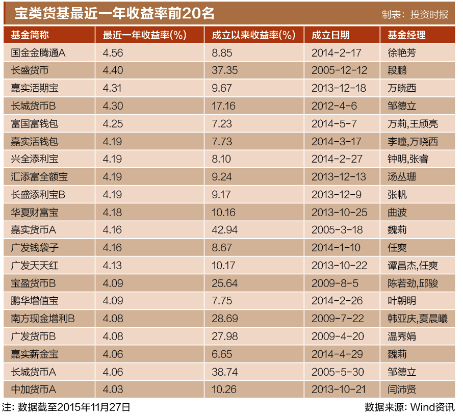 Wind资讯数据显示,截至2015年11月27日,嘉实货币A最近一年收益率为4.16%,位于全部383只货币基金的前1/4阵营,在“宝类”产品中排名第11。最近一年其区间7日年化收益率均值为4.17%,区间万份基金单位收益1.38元,分别超过3.48%和1.18元的行业平均水平。