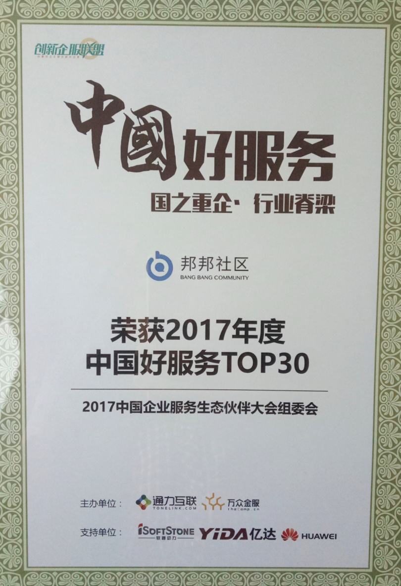 邦邦社区荣获“2017年度中国好服务TOP30”