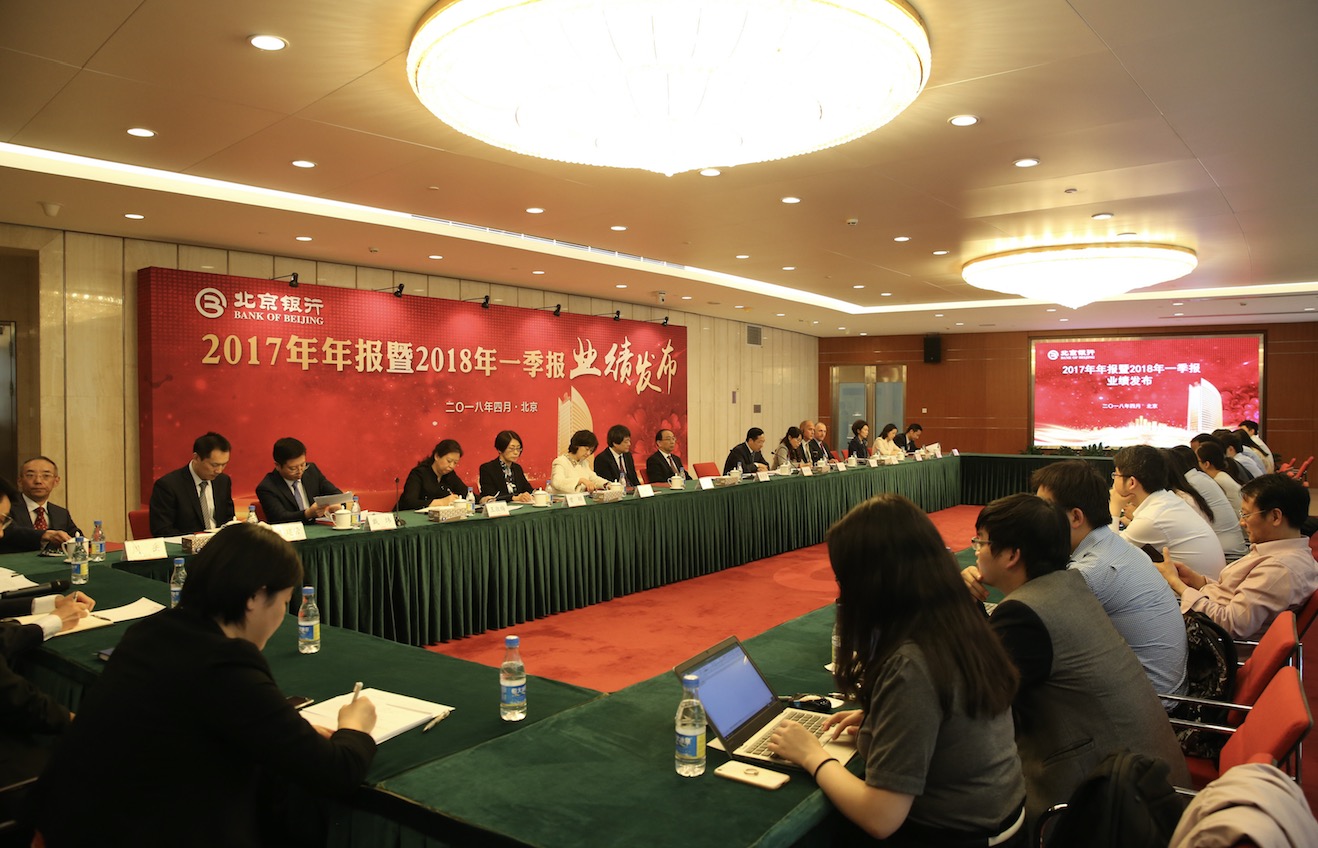 2018年4月26日,北京银行召开2017年年报暨2018年一季报业绩发布会,图为发布会现场。