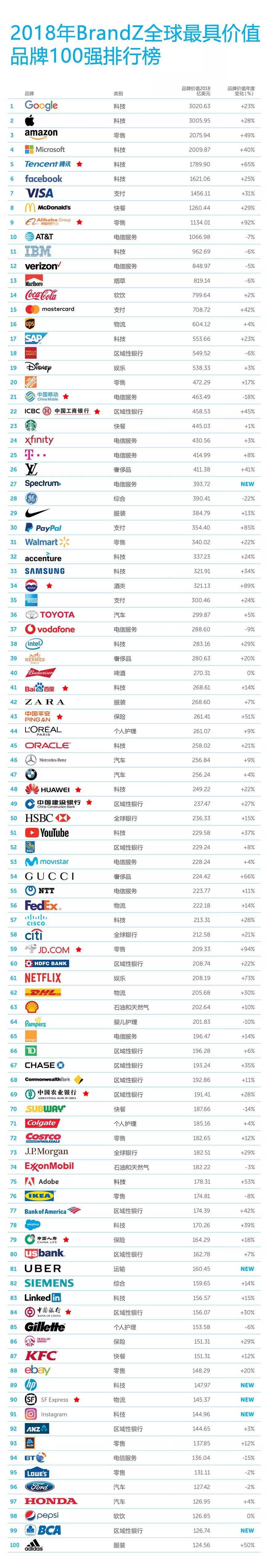 “BrandZ™全球品牌价值100强”是全球最权威、规模最大的品牌估值报告之一。该项品牌估值研究采用了业内独有的调查方式,将全球300多万消费者的访谈结果与各家公司财务和经营业绩分析相结合(根据凯度消费者指数和彭博的财务数据)。