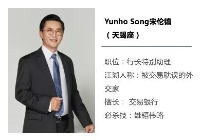 履历:Yunho是枚ABK(韩裔美国人),拿到美国乔治敦大学国际经济和金融,及商务外交双学位。人生一路开挂,履历金光闪闪:他是萨缪尔·蒙特嘉最年轻的副总裁、32岁就晋升为富士资本市场的常务董事及全球交易主管、负责欧洲、中东和非洲地区的货币及利率交易主管……他在美国银行履职期间,和英美监管互动频繁,常年为美联储,财政部,英国金管局的座上客,因为他不仅是出类拔萃的交易员,还是全球宏观经济学家。