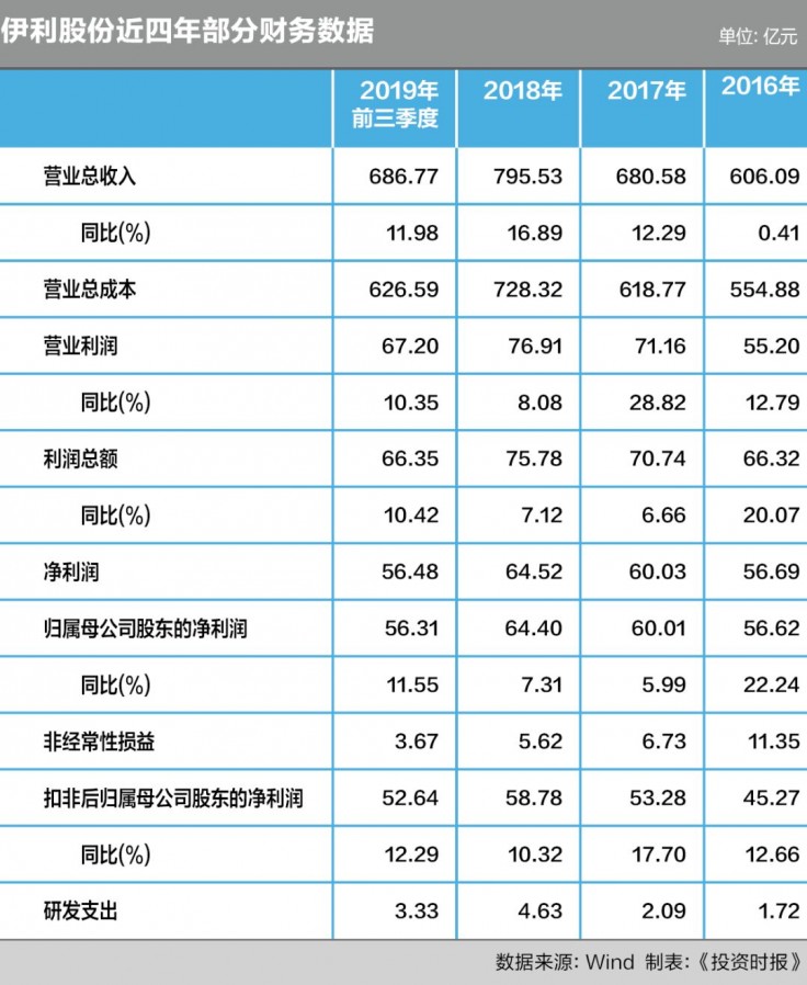 数据显示,今年前三季度,伊利股份实现营业总收入686.77亿元,同比增长11.98%;净利润达56.48亿元,同比增长11.73%,双双高位增长同时再创亚洲乳业新高。