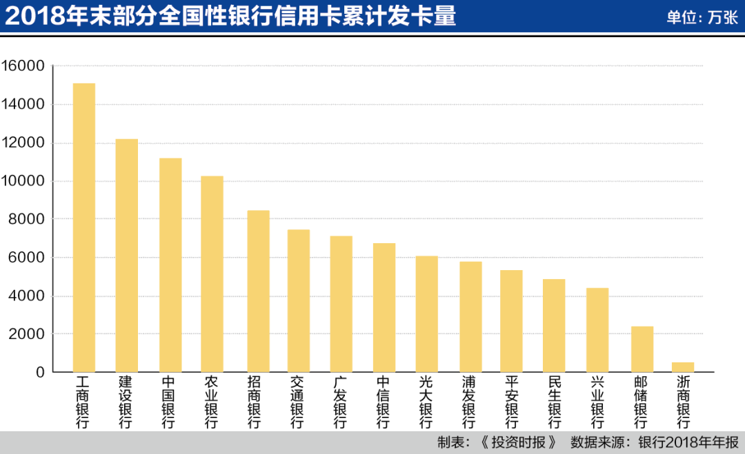 单家银行比较,国有银行中,信用卡累计发卡量最高的为“宇宙第一大行”工商银行,2018年末信用卡发卡量为1.51亿张。同比增速最高的为农业银行,2018年末发卡量10282.06万张,增长21.2%;增速最低的为工商银行,同比仅增长5.6%。