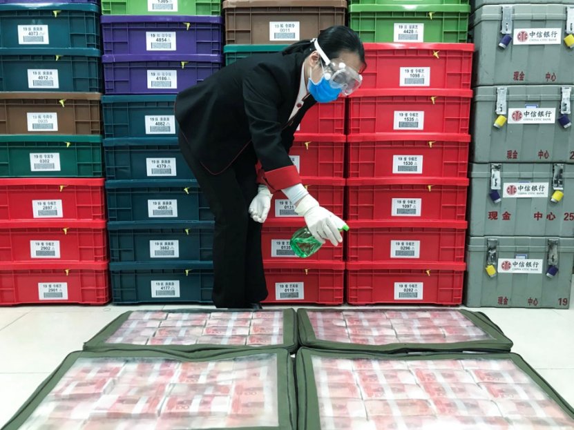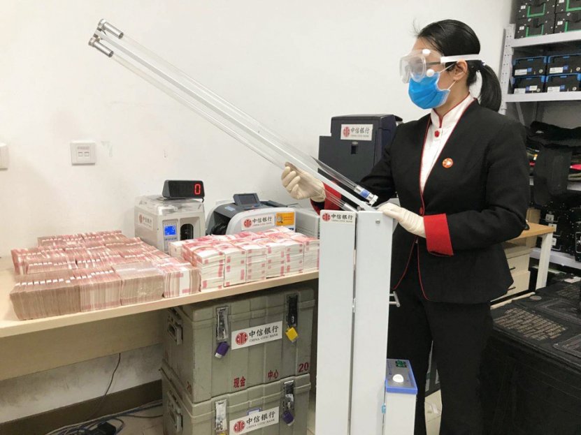 2月3日复工后,39岁的潘鹤允和另外两名同事多了一份工作:为现金消毒。疫情期间,根据当地防疫防控工作需要,中信银行南宁分行的营业网点开门营业时间,调整为上午10时,但他们每天上午8时30分便到达工作岗位:先是对办公场所用酒精进行消毒,等到送钞车到达后,工作人员将钱箱搬到日间库房。经过对钱箱进行表面喷洒消毒后,从钱箱中取出一捆捆现金,在清分台上铺开,再打开紫外线灯进行消毒。单次消毒时间不少于30分钟。