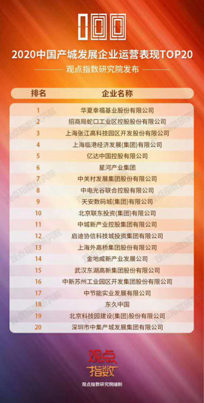 3月16日,观点指数研究院主办的2020观点年度论坛发布“2020中国产城发展企业运营表现TOP20”榜单,华夏幸福凭借优秀的产业新城运营表现荣膺榜首,招商蛇口、张江高科分列第二、三位。