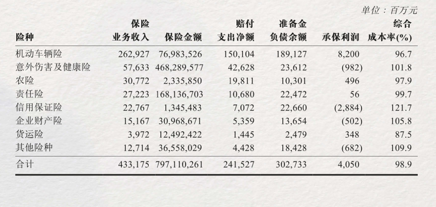 同时,该公司其他非车业务也不甚乐观,意外伤害及健康险承保亏损9.82亿元,企业财产险承保亏损5.02亿元,其他险种亏损6.82亿元。
