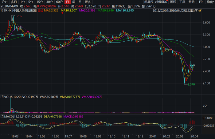 港股方面同样表现疲弱,前两年中国人保股价维持震荡调整格局,步入2020年后却大幅跳水,一度创出历史低点2.07港元。4月9日其收盘价为2.54港元,今年以来跌幅达到21.6%。