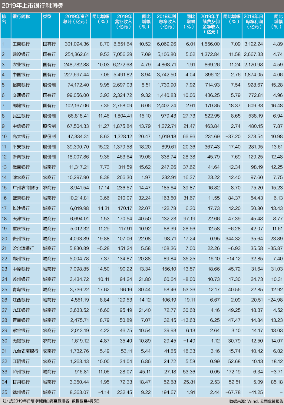 近期,标点财经研究院联合《投资时报》对A股和H股已发布2019年业绩报告的35家上市银行进行了梳理分析(截至4月5日),并按归属于母公司股东的净利润(下称归母净利润)这一指标由高至低排名,推出《上市银行利润榜》。