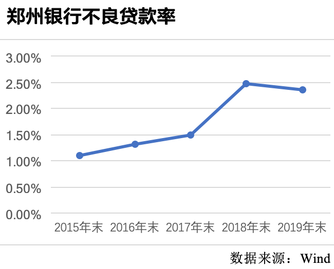 值得注意的是,在上市银行中,郑州银行不良贷款率持续偏高。截至2019年末,该行不良贷款率为2.37%,虽然较上年末降低0.1个百分点,但依然高于商业银行1.86%的整体水平,在纳入统计的35家上市银行中高居第三。郑州银行称,其制定不良资产三年处置方案以及风险资产管理专项激励方案,“开展风险资产管理包干制”,“进一步加大不良资产核销力度”。