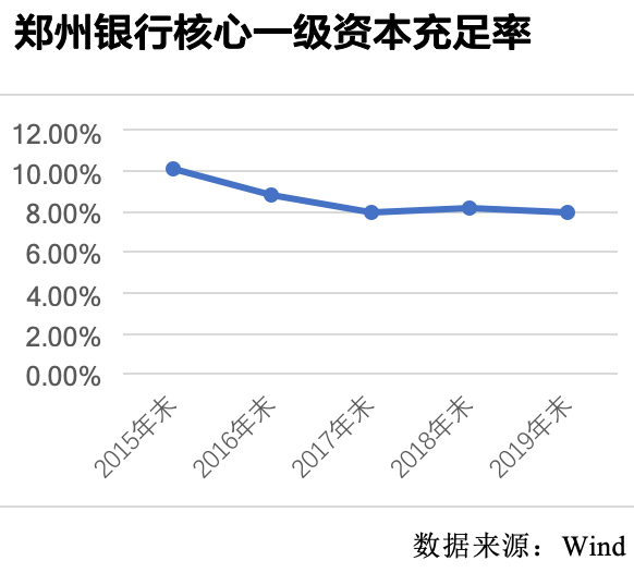 在发布年报的同时,郑州银行还公布了定增方案修订版,拟公开发行A股股票募集资金不超过60亿元,全部用于补充核心一级资本。2019年末,该行资本充足率、核心一级资本充足率分别为12.11%、7.98%,较上年末分别下降1.04个百分点、0.24个百分点,可见融资补血的需求愈发迫切。