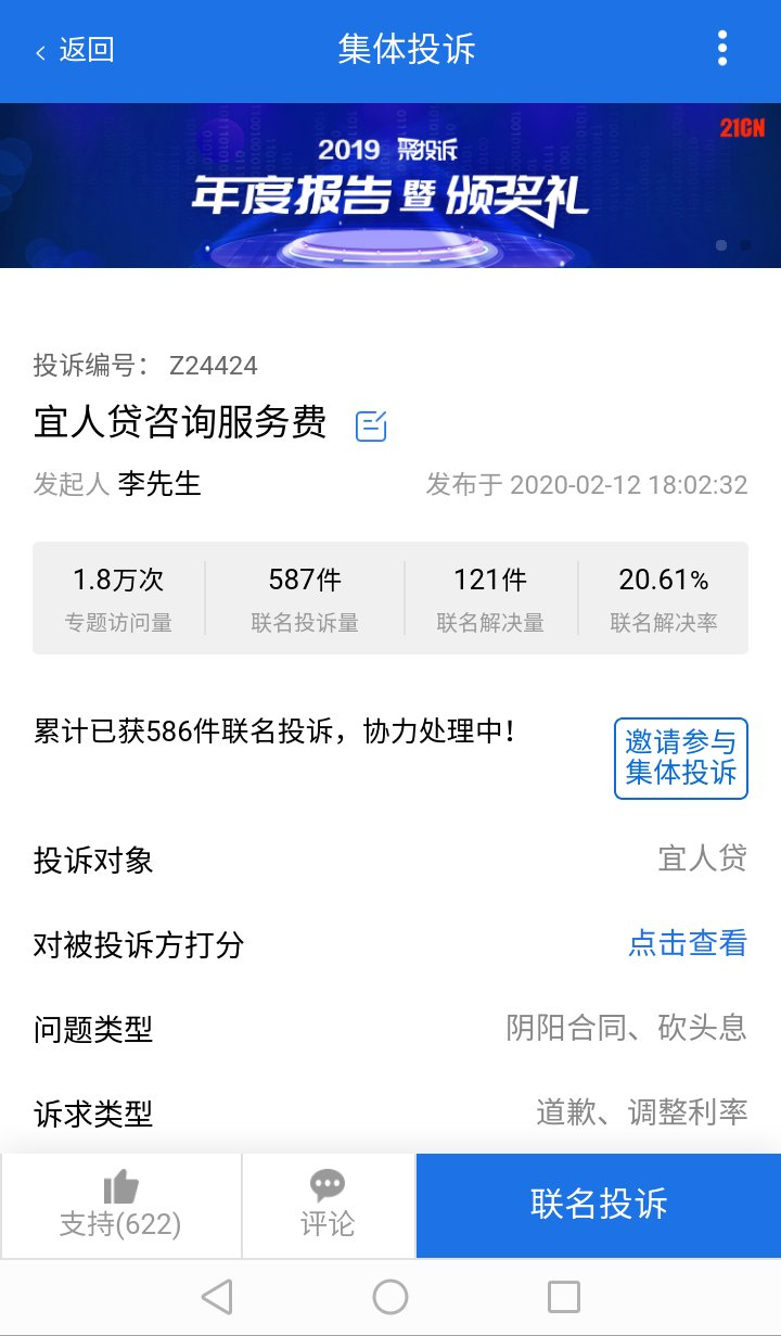 《投资时报》研究员发现,在聚投诉上还有一个对宜人贷的联名投诉,主题为“宜人贷咨询服务费”,最初发起投诉的时间是今年2月12日。截至5月12日的联名投诉量为586件,解决量为120件,解决率为20.44%。相关帖子已超过9000个。