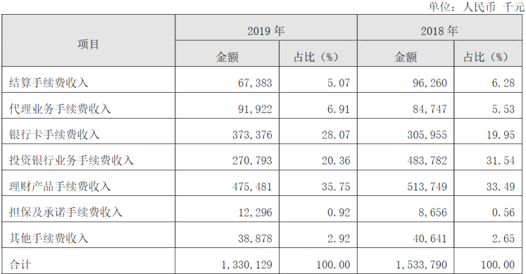 《投资时报》研究员还注意到,贵阳银行手续费及佣金收入方面露出疲态,较2018年下降2.04亿元至13.3亿元,降幅为13.28%。该行称主要系投资银行业务手续费收入下降所致,但实际上下降的还有结算业务、理财产品业务及其他的手续费收入。