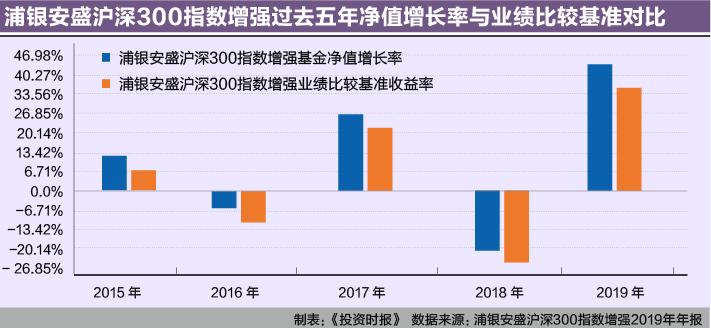 在《被动权益类基金5年大师榜》中,浦银安盛沪深300指数增强2015年至2019年以55.27%的净值增长率在312只产品中位列前10%。2019年年报数据显示,上述五年,该基金份额净值增长率超越业绩比较基准33.44%。