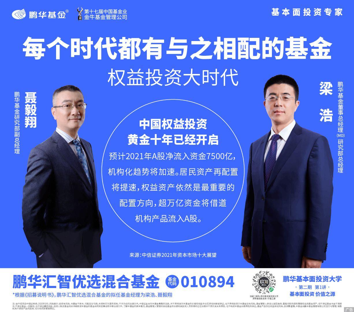 公告显示,鹏华基金旗下2021年的首只产品——鹏华汇智优选混合基金于1月4日起正式发行。据了解,该基金预期收益及预期风险水平高于债券型基金和货币市场基金,但低于股票型基金。权益投资方面,股票资产占基金资产的比例为60%至95%,其中港股通标的股票占股票资产的比例不超过50%。