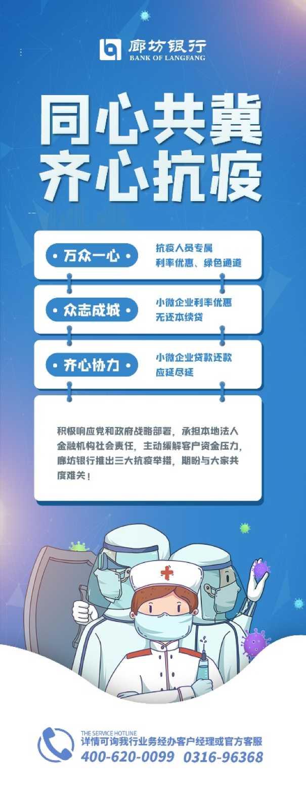 针对疫情中受困的小微企业和一线奋战的抗疫人员,廊坊银行积极响应政府和监管机构相关政策,推出三大优惠举措:为抗疫人员专属利率优惠和绿色通道;为小微企业提供优惠利率和无还本续贷服务;小微企业贷款还款,应延尽延。以金融服务的力量助力小微,支援一线抗疫工作。