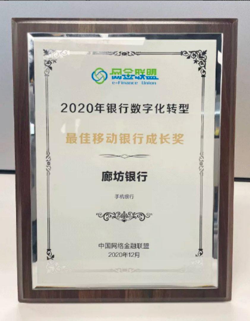 为助推银行业数字化转型发展,发掘银行数字化转型工作的先进榜样,展现2020年度银行数字化转型的创新成果,推动同业学习、交流,中国网络金融联盟组织举办了《2020年度银行数字化转型优秀案例征集活动》。在数字化转型征集活动中,廊坊银行手机银行荣获“最佳移动银行成长奖”。截至2020年12月,廊坊银行电子银行客户数同比增长45%,平均月活同比增长42%;手机银行客户数同比增长74%,平均月活同比增长63%。