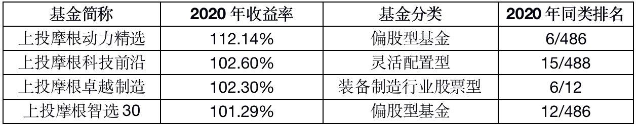 据银河证券数据,上投摩根动力精选、上投摩根科技前沿、上投摩根卓越制造、上投摩根智选30基金在2020年的收益率分别为112.14%、102.60%、102.30%、101.29%,当年度同类排名分别为6/486、15/488、6/12、12/486。其中,截至2020年12月31日,上投摩根科技前沿基金近四年同类排名5/228,上投摩根卓越制造基金近三年同类排名2/10。