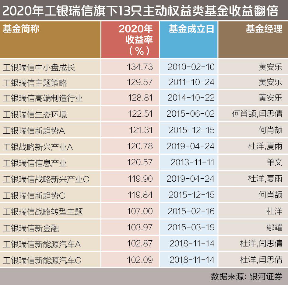 Wind数据显示,工银瑞信2020年有13只基金净值翻倍,数量为业内最多。海通证券发布的《基金公司权益及固定收益类资产业绩排行榜》显示,工银瑞信2020年以74.47%的收益率在权益类中型公司中排名第一,还以4.81%的收益率在固收类大型公司中排名第二?