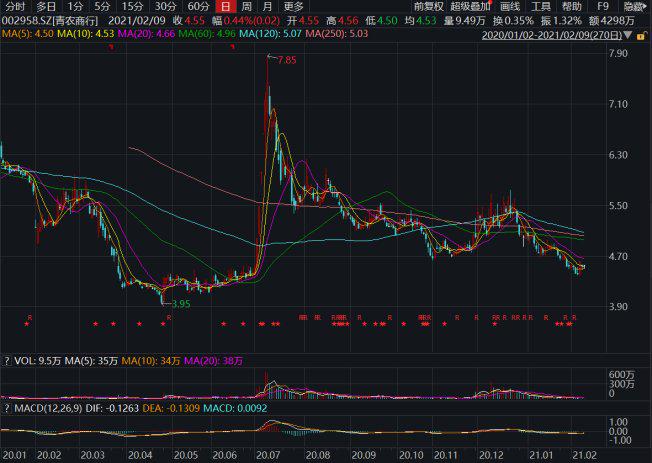 今年以来青农商行股价持续下行,2月8日收盘价为4.53元/股,年内跌幅为11%。
