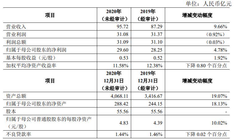 当年该行实现归属于母公司股东的净利润为29.6亿元,同比增长4.78%;营业利润为31.08亿元,同比增-0.92%;营业收入为95.72亿元,同比增长9.66%。