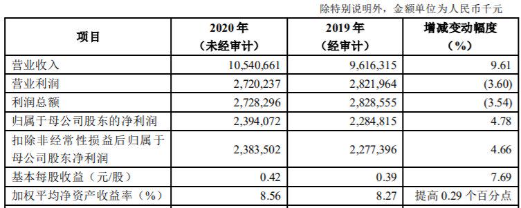 青岛银行在2020年业绩快报中表示,经营效益稳定提升,营业收入稳步增长。2020年,本公司归属于母公司股东净利润23.94亿元,比上年增加1.09亿元,增长4.78%;营业收入105.41亿元,比上年增加9.24亿元,增长9.61%。