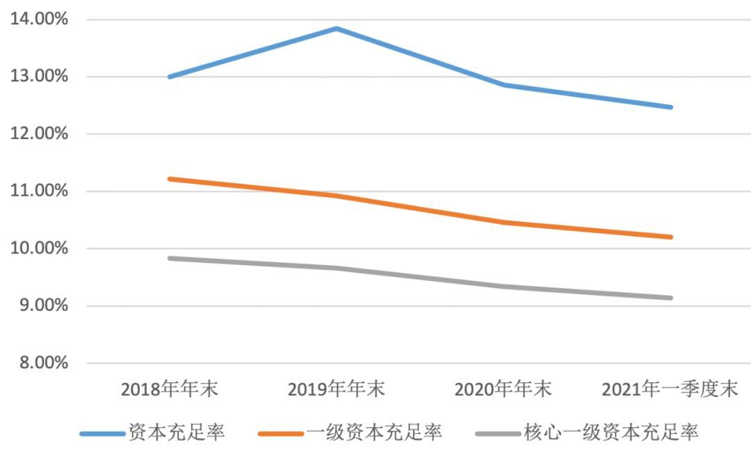 2021年一季度,上海银行的资产规模进一步扩张,资本充足指标仍保持下降趋势。具体来看,截至一季度末,该行总资产达到2.55万亿元,较上年末增长3.62%。而资本充足率为12.47%,一级资本充足率为10.20%,核心一级资本充足率为9.14%,与2020年年末相比均有所下降,分别下降0.39个百分比、0.26个百分比和0.20个百分比。