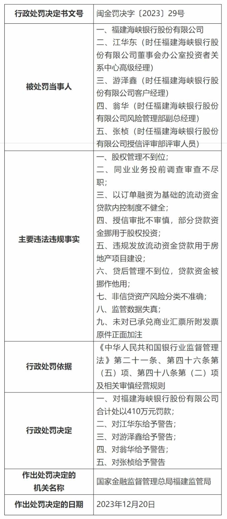 12月20日,国家金融监督管理总局福建监管局决定对海峡银行合计处以410万元罚款,主要原因包括:股权管理不到位;同业业务投前调查审查不尽职;以订单融资为基础的流动资金贷款内控制度不健全;授信审批不审慎,部分贷款资金挪用于股权投资;违规发放流动资金贷款用于房地产项目建设;贷后管理不到位,贷款资金被挪作他用;非信贷资产风险分类不准确等。