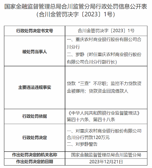 国家金融监督管理总局官网信息显示,2023年12月21日,国家金融监督管理总局合川监管分局决定对渝农商行合川分行罚款120万元,主要原因包括贷款“三查”不尽职、监控不力贷款资金被挪用、贷款资金回流借款人。