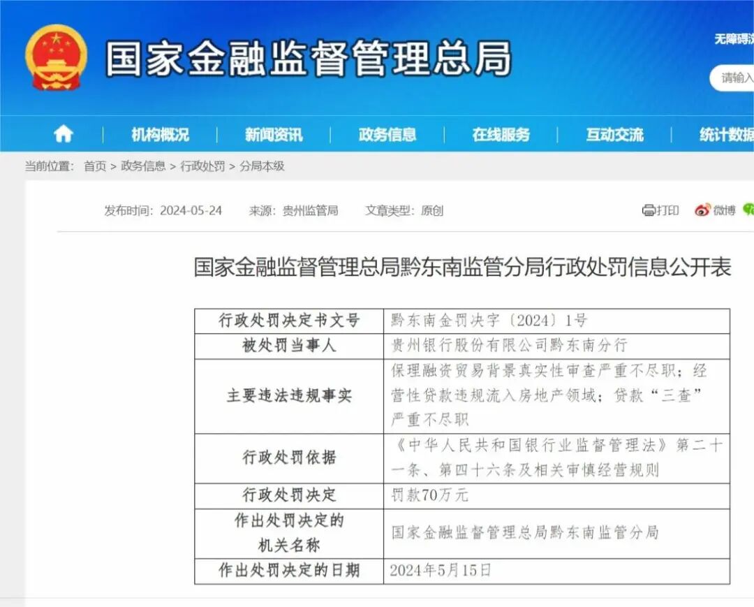5月15日,金融监管总局黔东南监管分局决定对贵州银行黔东南分行罚款70万元,主要原因包括保理融资贸易背景真实性审查严重不尽职、经营性贷款违规流入房地产领域、贷款“三查”严重不尽职。