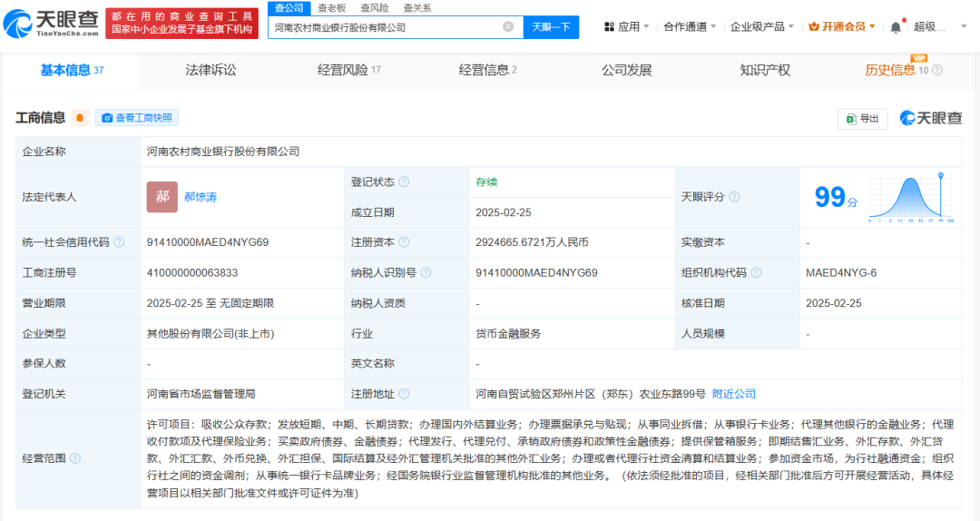 天眼查App显示,近日,河南农村商业银行股份有限公司成立,法定代表人为郝惊涛,注册资本约292.47亿人民币,经营范围包括吸收公众存款,发放短期、中期、长期贷款,办理国内外结算业务等。股东信息显示,该公司由河南农村商业联合银行股份有限公司、郑州农村商业银行股份有限公司、河南登封农村商业银行股份有限公司等共同持股。