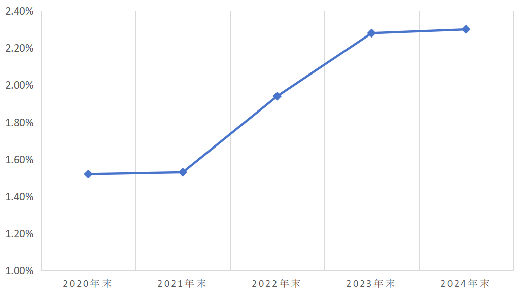 该行过往年报显示,2020年末—2024年末不良贷款率分别为1.52%、1.53%、1.94%、2.28%、2.3%。同期,商业银行不良贷款率分别为1.84%、1.73%、1.63%、1.59%、1.5%。