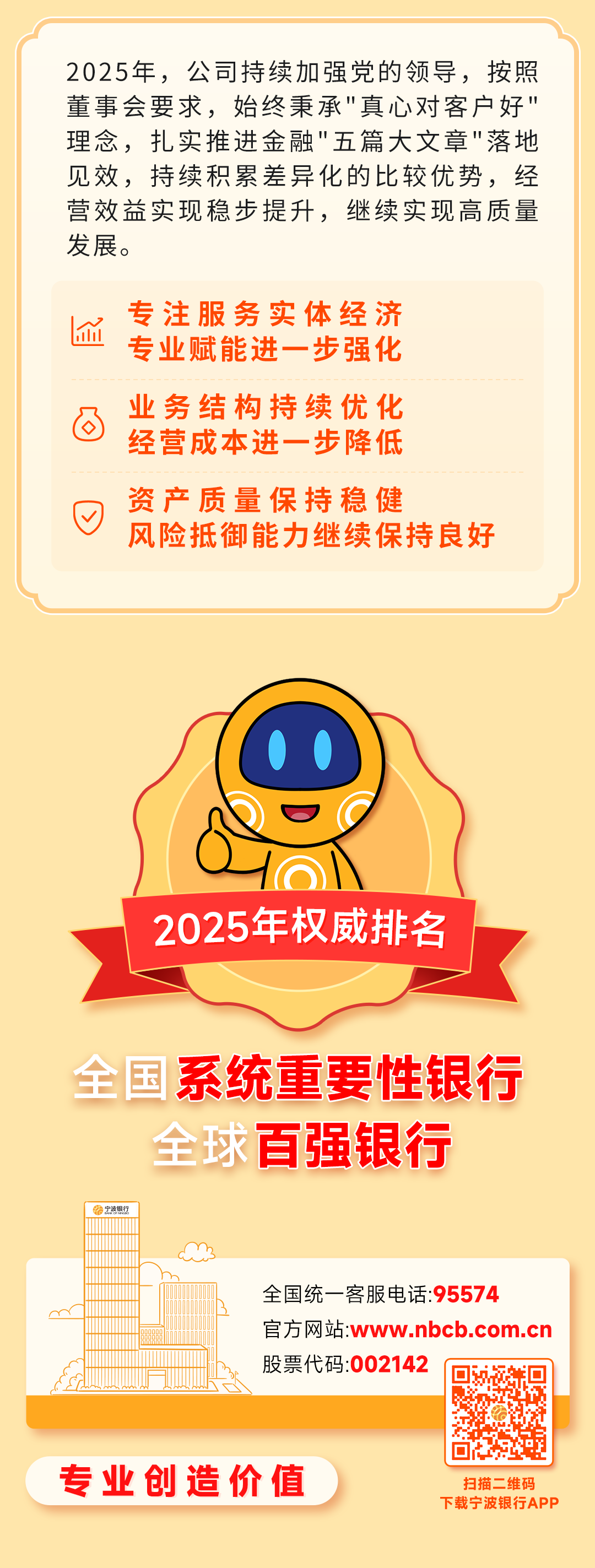 2025年,面对复杂多变的经营环境,宁波银行持续加强党的领导,按照董事会的要求,始终秉承“真心对客户好”的理念,扎实推进金融“五篇大文章”落地见效,持续积累差异化的比较优势,经营效益实现稳步提升,继续实现了高质量发展。