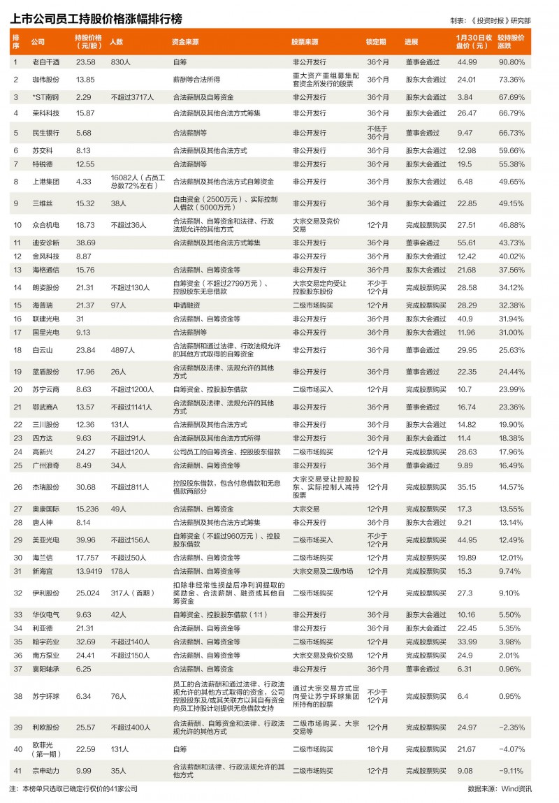 从已完成股票购买和已公布定增价格的公司来看,截至1月30日,不少企业的员工持股计划已有了可观的浮动收益。其中,老白干酒股价已较行权价格上涨90.80%,成为名副其实的最牛员工持股计划,而珈伟股份和*ST南钢的股价分别较行权价格上涨73.36%和67.69%,位列第二和第三名。