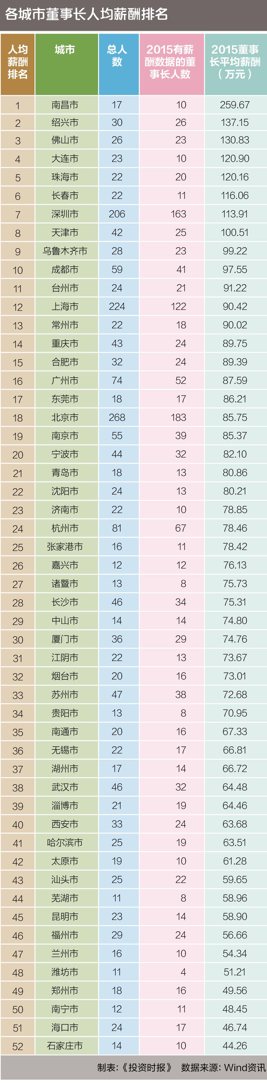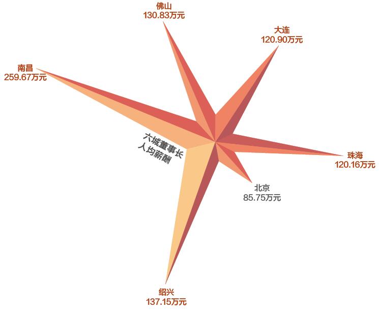 研究结果显示,2015年董事长人均薪酬超过百万元的城市有8个,南昌以259.67万元出人意料排在首位。而“北上广深”四大一线城市中,竟然只有深圳的董事长人均薪酬进入前十。