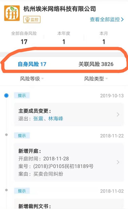 据企查查风险扫描信息显示,截至目前,埃米网络自身风险为17条,主要集中在司法风险和工商风险,关联风险(主要为关联公司风险)则高达3826条;寻梦信息自身风险高达3793条,主要集中在网络购物合同纠纷、知识产权与竞争纠纷,商标权权属、网络服务合同纠纷等方面。
