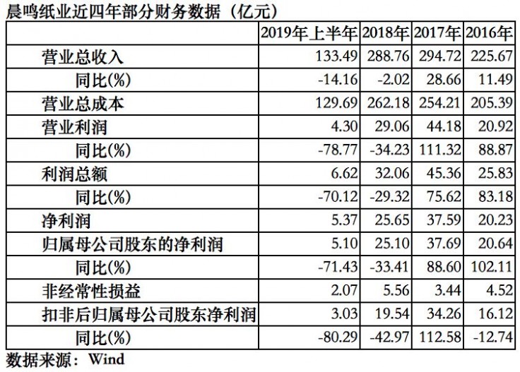 根据Wind数据提供的扣非净利润数据,标点财经研究院日前联合《投资时报》推出《2019上半年A股上市公司扣非净利降幅榜》。结果显示,晨鸣纸业2019年上半年扣非后归母净利润为3.03亿元,同比下降80.29%。