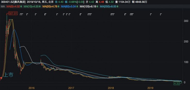此外,暴风集团已多次发布关于股票存在被暂停上市风险的提示性公告。截至10月18日,该公司股价以4.4元/股报收,较52周高点下挫61.74%。而当日出现的4.32元/股低点,也成为暴风集团近四年以来最低股价。
