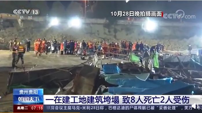 10月28日,贵州市观山湖区美的置业一施工地下停车场发生垮塌事件。有权威消息来源称,在垮塌事故发生前,该施工工地上岗当班人员共计14人,事故发生时有3人自行逃出,1人被迅速救起,10人被困失联。被困10人中,2人受伤,其余8人不幸未能被挽救回生命。
