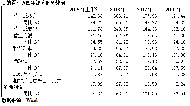 《投资时报》研究员查阅Wind数据注意到,2016至2018年及2019年上半年,美的置业分别实现营业收入120.44亿元、177.98亿元、303.21亿元及142.88亿元,同比增长分别为44.82%、47.77%、69.91%及34.22%,净利润分别实现10.07亿元、19.12亿元、32.10亿元及17.69亿元,增速分别为157.59%、89.84%、67.85%及20.11%,可以看到,其净利润增速已呈现明显下滑趋势。