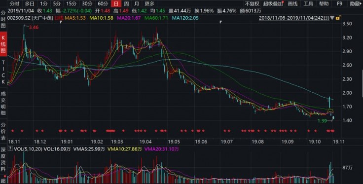 不过,子公司此番动作还是让天广中茂得以列入区块链行列,在此次区块链风口下也有所表现,但在业绩颓势、债务危机的现实面前很快退潮,股价也露出真面目——11月4日1.43元的收盘价比此轮上涨前的10月25日1.53元的收盘价还低了6.54%,期间,于11月3日还创下1.39元的股价历史最低。