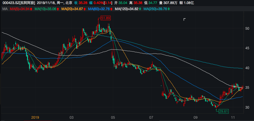 截至2019年11月19日收盘,东阿阿胶报收于35.31元/股,已较前期高点下挫50%。