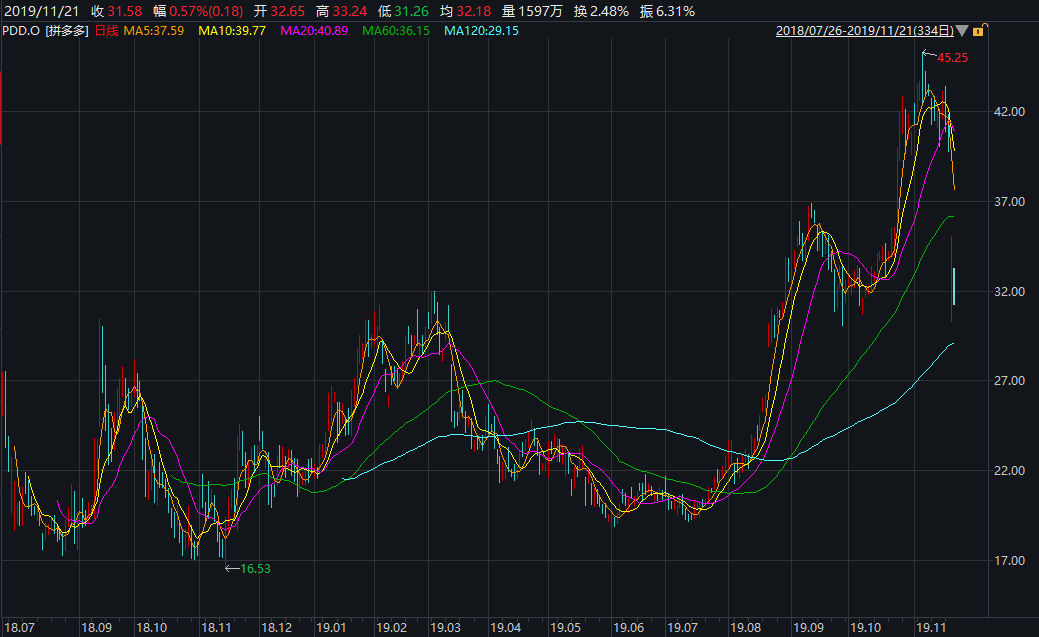 在营收、净利润未达市场预期的情况下,拼多多股价当日暴跌22.89%,盘中曾一度下探至30.26美元/ADS,最终收于31.40美元/ADS,创上市以来最大单日跌幅,市值当天即蒸发近120亿美元。