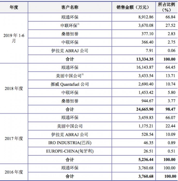 其中,2016年恒誉环保3760.68万元的营业收入全部来源于顺通环保;2017年,对顺通环保和美丽中国公司的营业收入占当年营收的88.51%;2018年,来自顺通环保和美丽中国公司的收入仍然占据公司营收前两位,占比达78.16%;2019年上半年,来自顺通环保和申联环保的收入占销售总额的94.36%。