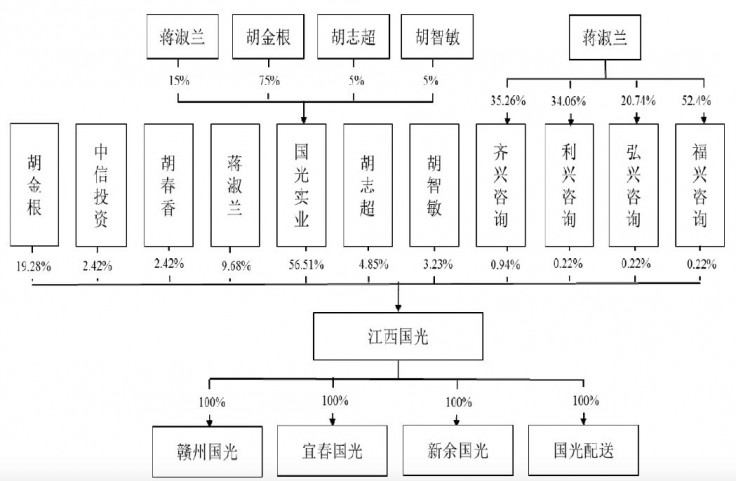 招股书显示,胡金根、蒋淑兰、胡志超、胡智敏分别持有国光实业75.00%、15.00%、5.00%、5.00%股权,而国光实业持有江西国光56.51%股权。此外,胡金根、蒋淑兰、胡志超、胡智敏、胡春香还直接持有江西国光19.28%—2.42%的股权。与此同时,蒋淑兰还担任齐兴咨询、利兴咨询、弘兴咨询、福兴咨询普通合伙人,并通过前述公司直接持有江西国光0.94%、0.22%、0.22%和0.22%股权。整体来看,胡金根家族持有该公司股权比例高达97.58%。