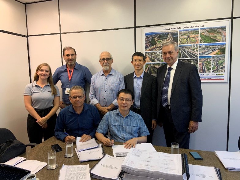 在巴伊亚州民政部长Bruno Dauster(后排中)的见证下,比亚迪巴西分公司总经理李铁与巴伊亚州交通运营公司CTB主席José Eduardo Ribeiro Copello共同签署整体设计方案合约