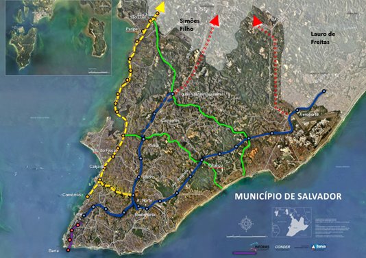 建成后,萨尔瓦多云轨线(黄色线条)将与其它轨道交通线共同打造轨道交通网